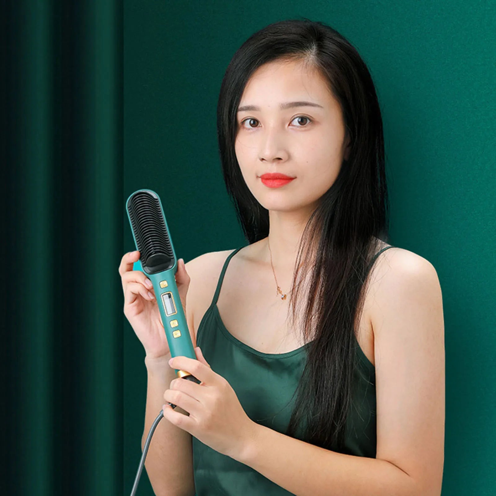 Introducing the 2-in-1 Electric Professional Negative Ion Hair Straightener Brush, a versatile tool designed for seamless styling and grooming. This advanced device features a built-in LCD display for easy temperature adjustments and precise control. Equipped with negative ion technology, it helps to reduce frizz and enhance shine, delivering smooth, sleek results whether you're straightening or curling your hair. The innovative brush design allows for effortless styling, combining the benefits of a straightener and curling tool in one convenient device. Perfect for achieving a variety of looks, from sleek straight hair to bouncy curls, this professional-grade brush offers both functionality and ease of use for all your hair styling needs.