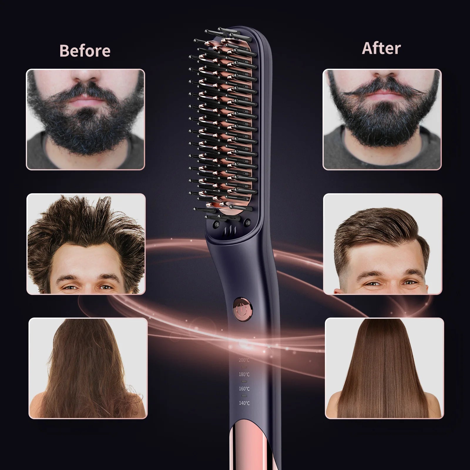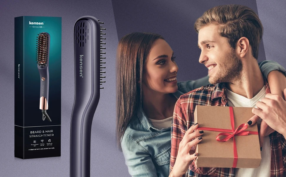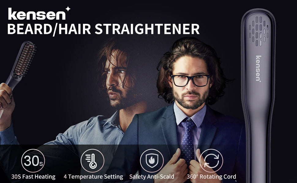 Introducing the Kensen Beard Straightener Brush, the ultimate tool for effortless beard and hair styling. This versatile comb features negative ion heating technology to quickly straighten and style your beard or hair, reducing frizz and enhancing shine. Its ergonomic design ensures comfortable handling while the advanced heating element provides consistent, even heat for effective results. Perfect for both straightening and curling, this brush offers a quick and easy solution for achieving a polished, well-groomed look. Ideal for men who value both style and convenience, the Kensen Beard Straightener Brush combines performance with practicality for a superior grooming experience.