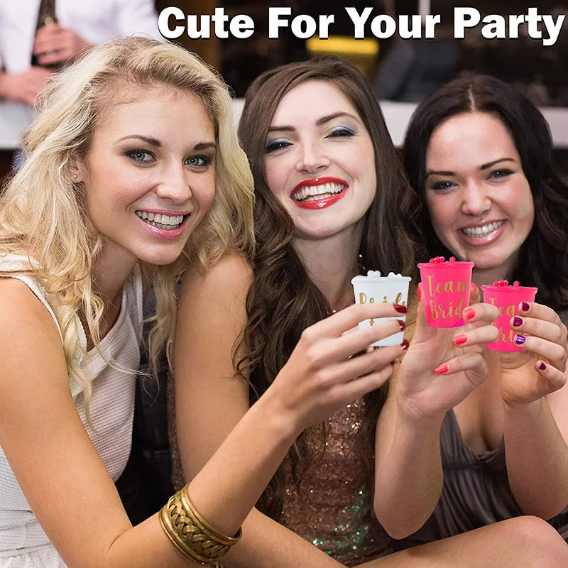 Team Bride Cups: Includes stylish plastic cups featuring "Team Bride" designs, perfect for toasting and enjoying beverages with the bridal party.